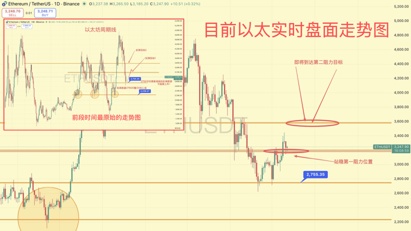 Let's take a look at Ethereum: Recently, ETH has experienced a surge and then a pullback, breaking through the first resistance level. It aims to challenge the second resistance level, which is within expectations. Currently, it seems to have stabilized above the first resistance level, and as long as Bitcoin can easily lead the way, ETH can easily reach the second resistance level, with prices around 3600. For those who got in earlier, hold on tight; a rebound is expected.