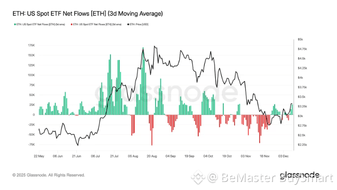 👉 The flow pattern tells the story clearly—red dominated the charts from September through November as investors pulled money out week after week. That steady drain matched Ethereum's price decline almost perfectly. But recently, green bars started appearing again on the three-day moving average, showing fresh capital coming back in. It looks like the wave of forced selling might finally be running out of steam.
