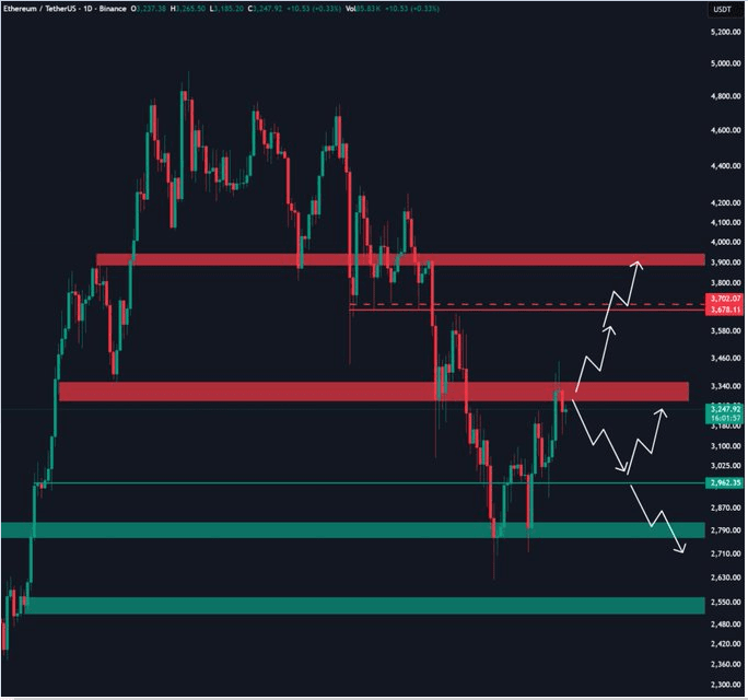 Ethereum is charging towards the resistance level again! The key is whether it can stabilize above 3400 USD on the daily chart: if it stabilizes, it will run towards 3700-3800 USD; if it doesn't stabilize, it will have to test the support at 3000 USD again, don't blindly chase highs, wait for a clear direction before taking action!