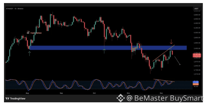 👉 After bouncing back from November's lows, Ethereum climbed right back into the same overhead zone that triggered previous selloffs. The rejection confirms that sellers are still active at this level, blocking ETH from breaking higher. Combined with the momentum divergence, these signals paint a cautious picture for the near term.