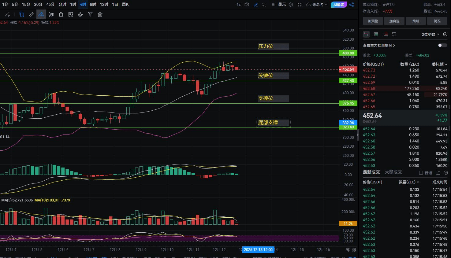 The chart doesn't lie. The 4-hour candlestick chart of ZEC shows a clear downward structure. Resistance at 488.00, key level at 427.43, support at 425.65, and bottom support at 376.45.