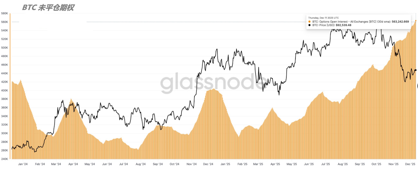 BTC options OI (30d sma) has reached a new historical high! It has reached a scale of 563,242 BTC. In the last cycle, the derivatives market was mainly dominated by perpetual/futures contracts, and the weight of the options market was not large.