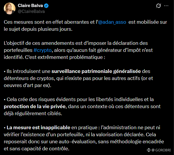 L’argument principal soulevé par des acteurs comme l’ADAN (Association pour le développement des actifs numériques) et plus particulièrement par sa directrice générale : Claire Balva. Pour elle, le problème réside dans l’instauration d’une « surveillance patrimoniale généralisée » qui n’existe pour aucun autre actif détenu sans intermédiaire.