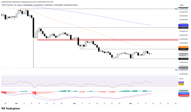 Pepe is struggling to regain the psychological level of 0.00000500, consolidating within a sideways range.