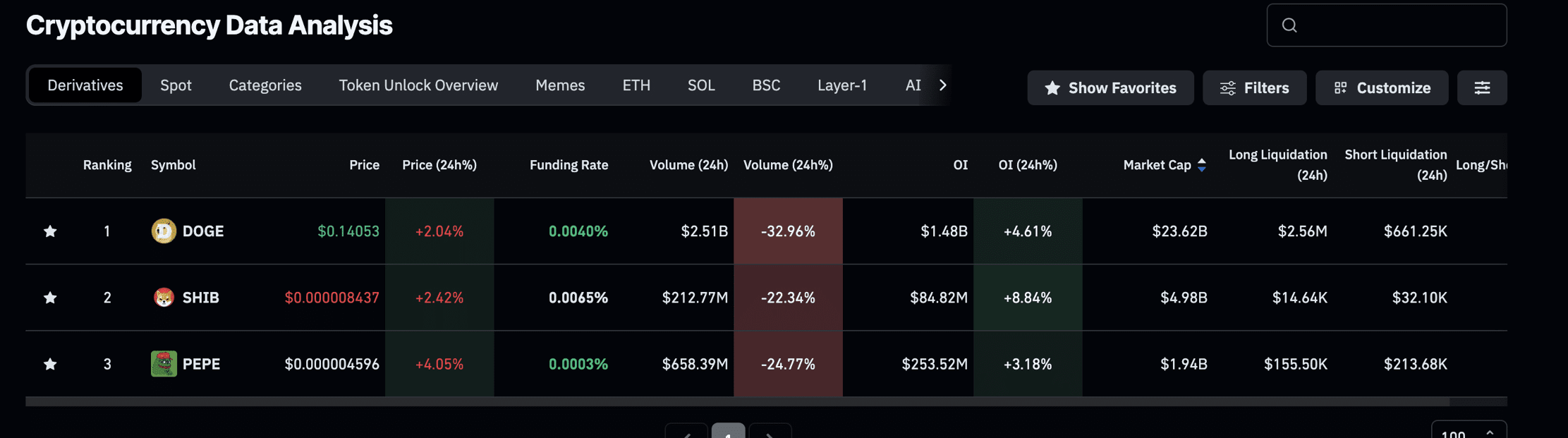 CoinGlass data show that the open interest in DOGE, SHIB, and PEPE contracts - the nominal value of both long and short positions - has increased by 4%, 8%, and 3% to reach $1.48 billion, $84.82 million, and $253.52 million, respectively. This indicates growing retail interest in meme coins.