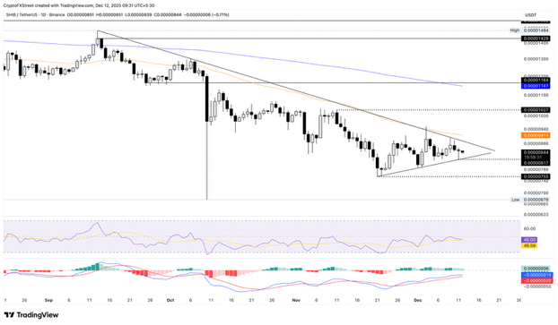 Shiba Inu is down about 1% at the time of writing this report on Friday, marking its third consecutive day in the red. However, the rebound from $0.00000817 (Thursday's low) at the support line connecting the November 21 and December 1 lows suggests underlying demand for SHIB.