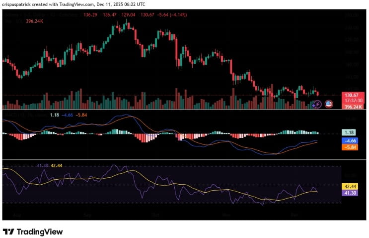 RSI is around the level of 41—which indicates that Solana is still range-bound but is emerging from the oversold zone that occurred at the end of November.