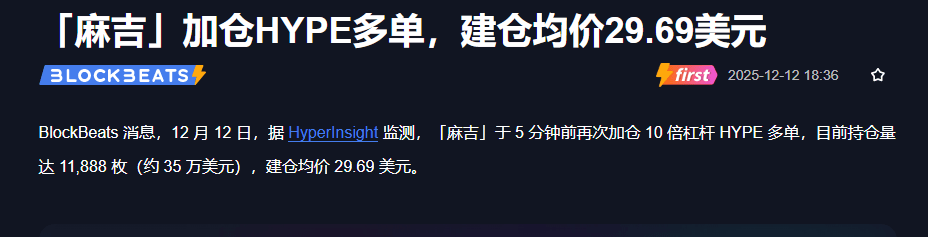 'Maji' used 10x leverage to increase their position in HYPE, currently holding a value of about $350,000. This action itself is a signal from the market, indicating that funds chose this asset at a specific point in time and used a larger volatility leverage.