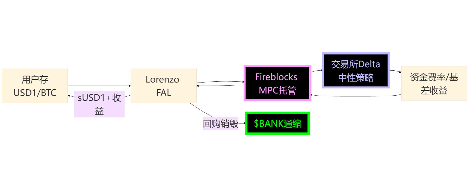 The so-called CeDeFi architecture essentially builds a bridge with a 'safety cushion' between decentralized transparency and centralized liquidity. In Lorenzo's system, the Financial Abstraction Layer (FAL) acts as the commander. It no longer sends user funds directly to the exchange's hot wallet to 'run naked,' but collaborates with institutional custodians such as Fireblocks and Ceffu, using off-exchange mirroring technology. This means that the funds are always locked in a regulated MPC multi-signature vault, and the exchange only receives a mapped amount of the funds for executing delta-neutral quantitative strategies. This design completely severs the hands of exchanges from misappropriating user funds while retaining the seemingly bottomless liquidity depth of CEX. The BANK token, as the settlement medium in this architecture, triggers the burning of protocol revenue with each on-chain and off-chain fund transfer settlement.