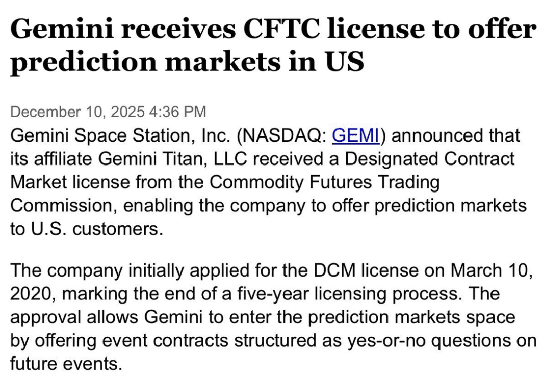 2. At the same time, it became known that the crypto exchange Gemini is obtaining a CFTC license to launch a prediction market on its platform.