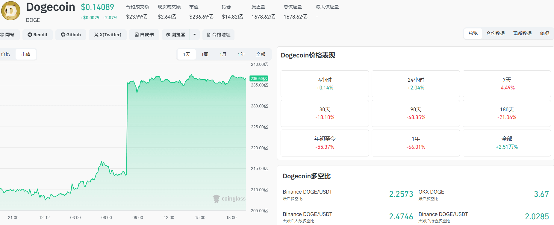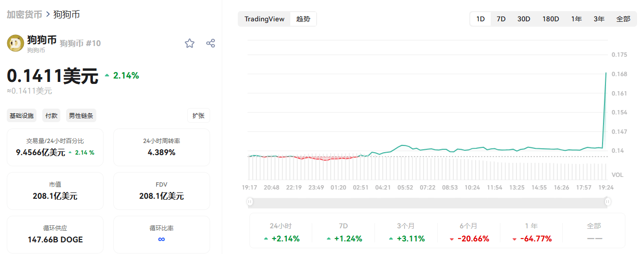 Market cap still exceeds 20 billion dollars — a skinny dead camel is bigger than a horse, the consensus on DOGE remains, but there are no new stories, it can only follow the market trend.
