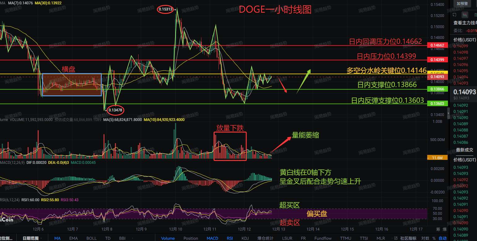 DOGE is struggling at the 0.14146 bull-bear dividing line, with overhead resistances at 0.14399 and 0.14662 like a pot cover, and below supports at 0.13866 and 0.13603 like paper. The MACD shows a golden cross below the zero line but lacks strength, and the volume continues to shrink—this is a typical 'downward continuation resting zone'. The weaker the rebound, the harder the subsequent crash!