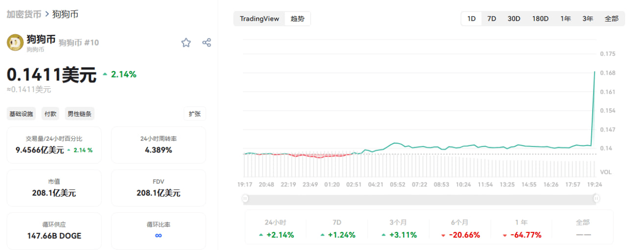 Brothers, I am Xin Ying. I just came across some data that got me alert - Dogecoin (DOGE) has a market cap still stuck at 20.8 billion USD, but the price has fallen to 0.1411, down 2.14% in the last 24 hours. This is not a 'dog', this is clearly a 'sick dog'!
