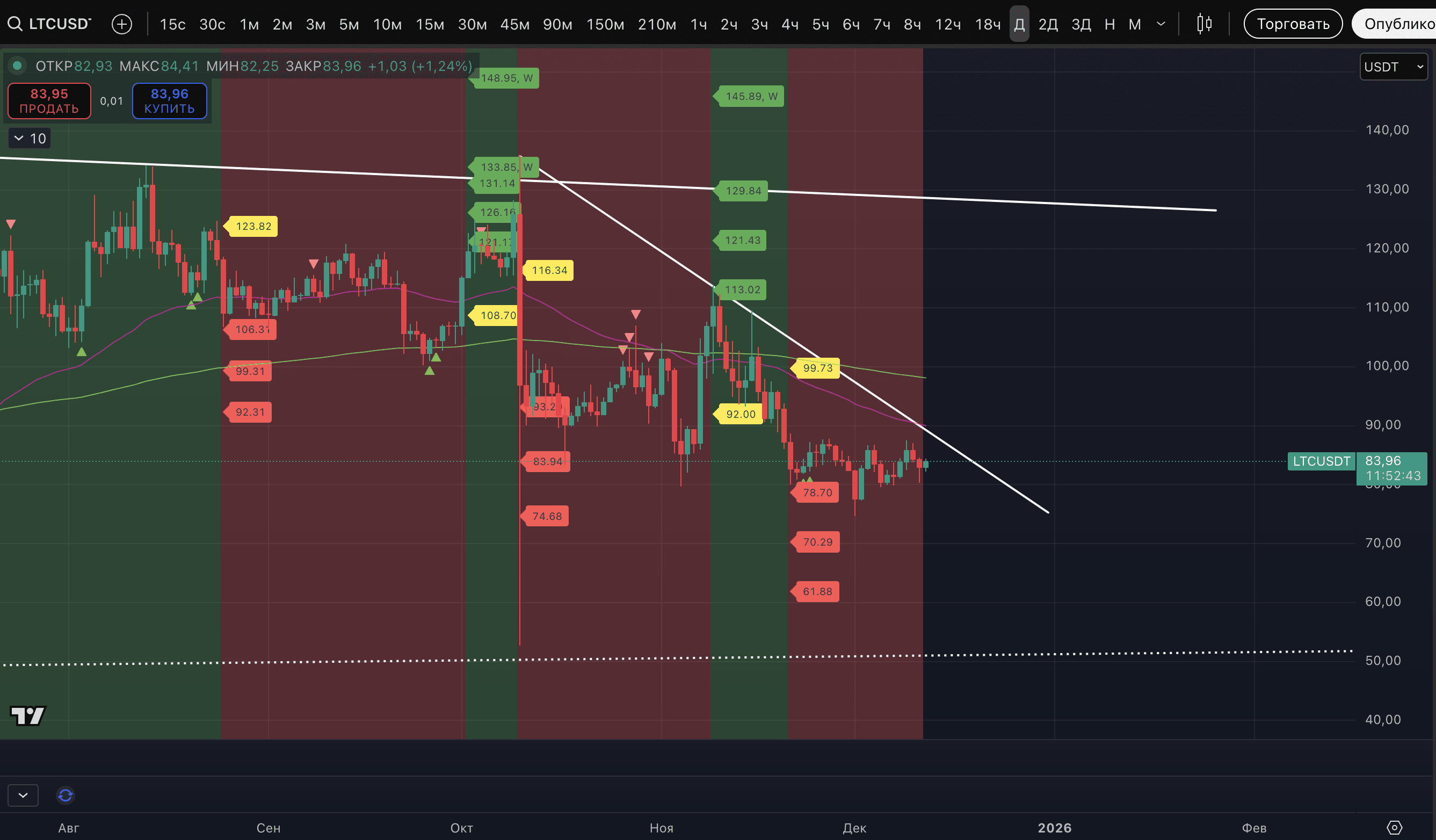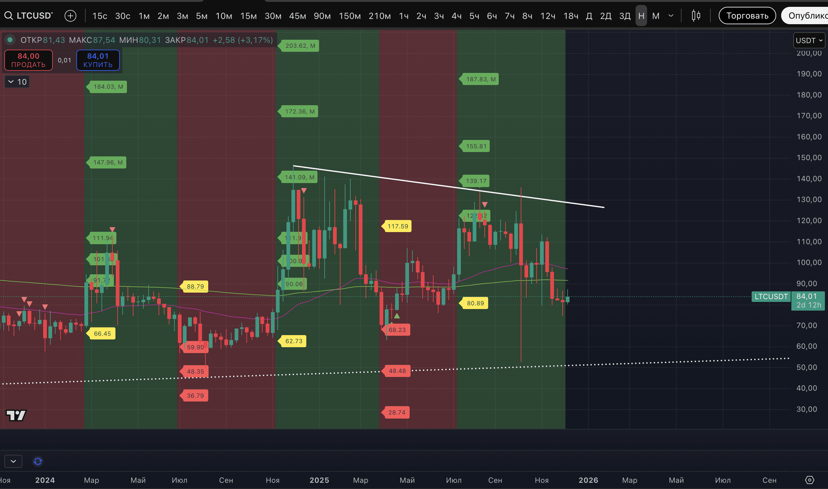 At the same time, the 3-day and weekly timeframe for the asset remain in stable uptrends, and on the 3-day timeframe Litecoin has passed through two potential low marks. There is a chance not to delay exiting under the trend resistance.