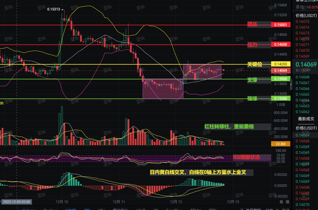 Let's analyze the key levels. Above, 0.14600 is the first ghost gate, and 0.15001 is the ceiling that has been difficult to surpass recently. Why do I say this? Look at the candlestick chart, every time it rebounds to this area, it gets smashed down hard, accumulating a large amount of trapped positions.