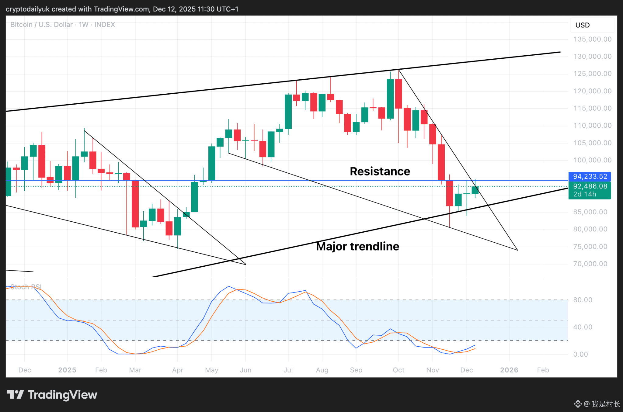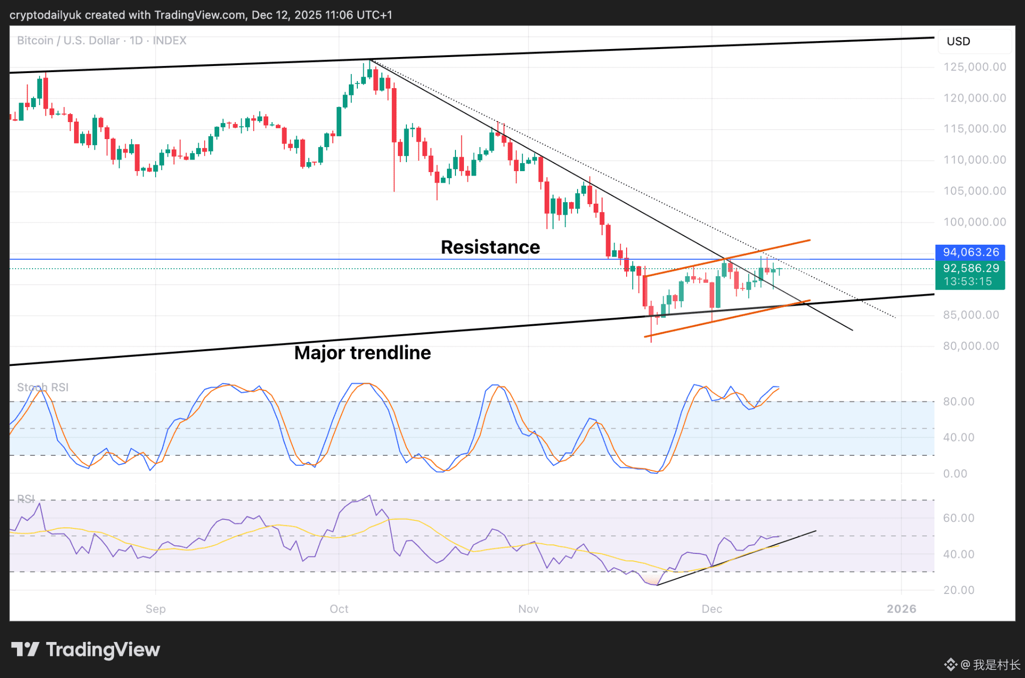 多头或空头终将让步,而这一刻也即将到来,因为 94,000 美元水平阻力位与主要趋势线之间的空间正在缩小。