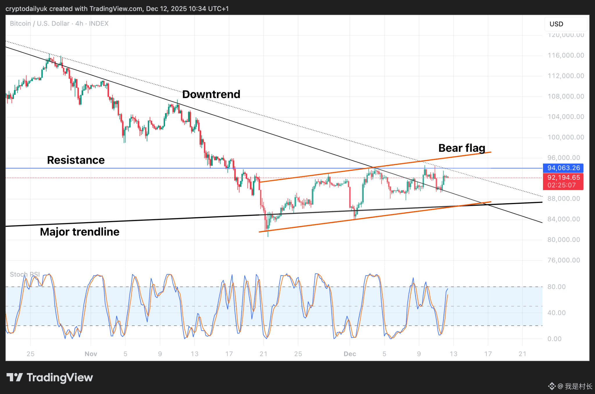 BTC的短期图表显示,价格走势仍在横盘整理,但略微偏向上行。图中显示了两条下降趋势线,因为如果仅根据蜡烛图的影线来判断,突破可能尚未发生。尽管如此,价格已经开始触及 94,000 美元的水平阻力位。外侧的下降趋势线目前位于该阻力位下方。