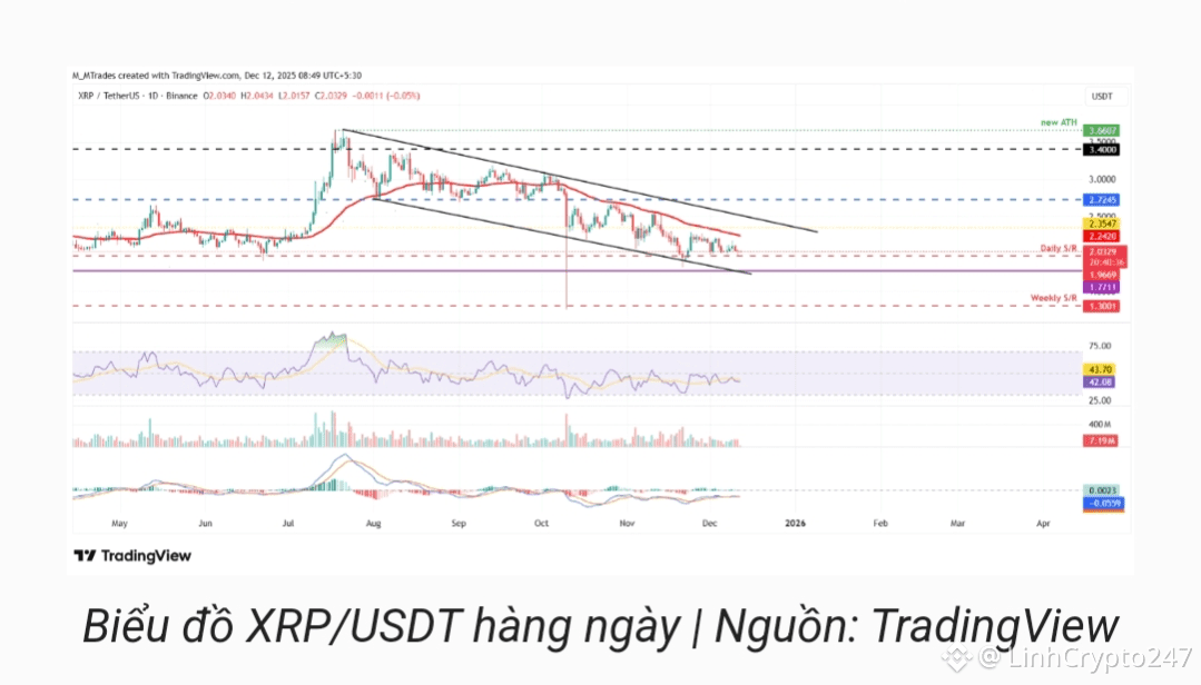 XRP bounced from $1.96 support on Sunday, gaining 3.66% over two days before strong selling on Wednesday erased gains. Price again retested $1.96 and is currently stabilizing around $2.03, reflecting cautious sentiment.