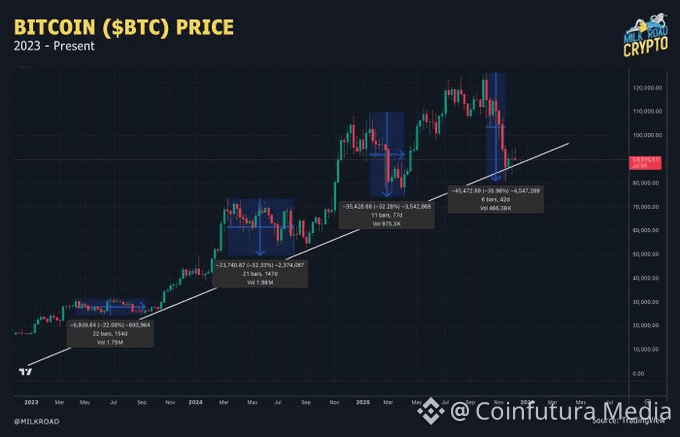 Bitcoin’s recent retracement aligns with the market behavior described by Milk Road, which notes that past expansions were followed by sharp resets. The latest move has lasted about 40 days, placing the asset early in its typical correction window. Previous cycles took far longer to stabilize, often stretching to more than 100 days before a durable floor emerged.