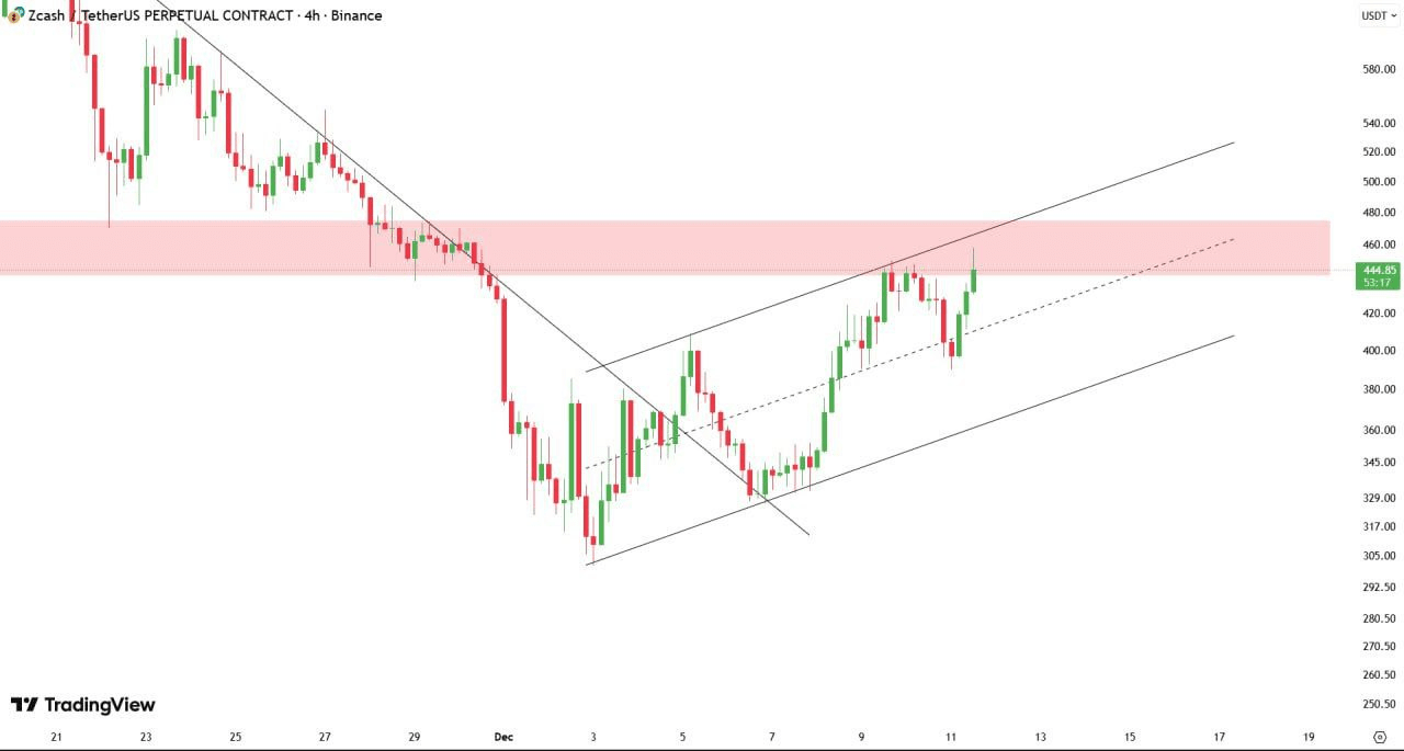 A strong breakout above this zone could unleash a powerful rally, potentially pushing ZEC toward the $500+ region.