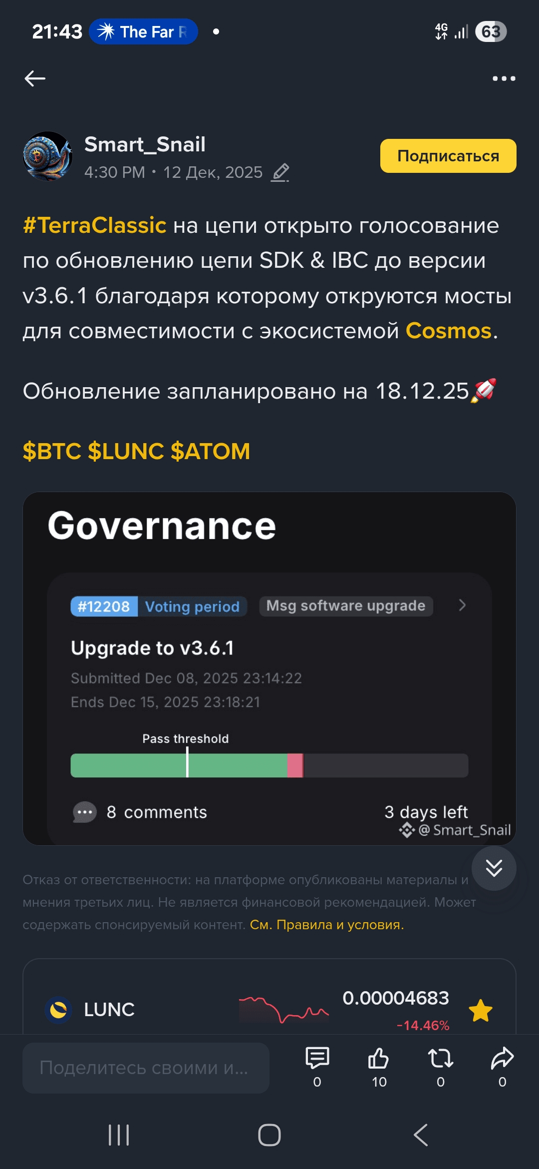 Many channels are currently writing that December 18 (or some say 17) will be the "day of the resurrection of LUNC" thanks to the voting on the v3.6.1 update. As a newcomer, I would have fallen for it myself. But, after analyzing the facts, I realized: technical news ≠ price increase.