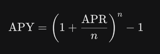 APY is calculated using compound interest, and the formula must consider the number of compounding periods in a year (n). (Mathematical formula rendering is not available, so just make do with it!)