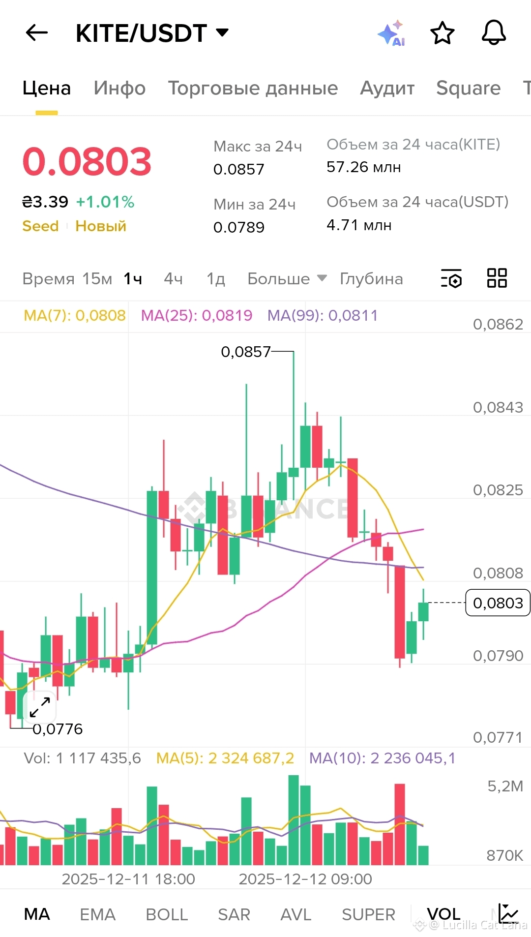 Тепер про графік. Дивлюся на ці свічки на 1-годинному таймфреймі і розумію, що ми зараз у фазі консолідації після попереднього зростання. Ціна 0.0803 USDT – це як би зависла в повітрі. Ми відійшли від максимуму 0.0857, який був буквально вчора, і це нормально. Ринок дихає. 24-годинний обсяг у 57.26 мільйонів KITE і 4.71 мільйонів USDT показує, що інтерес не згас, трейдери все ще активні.
