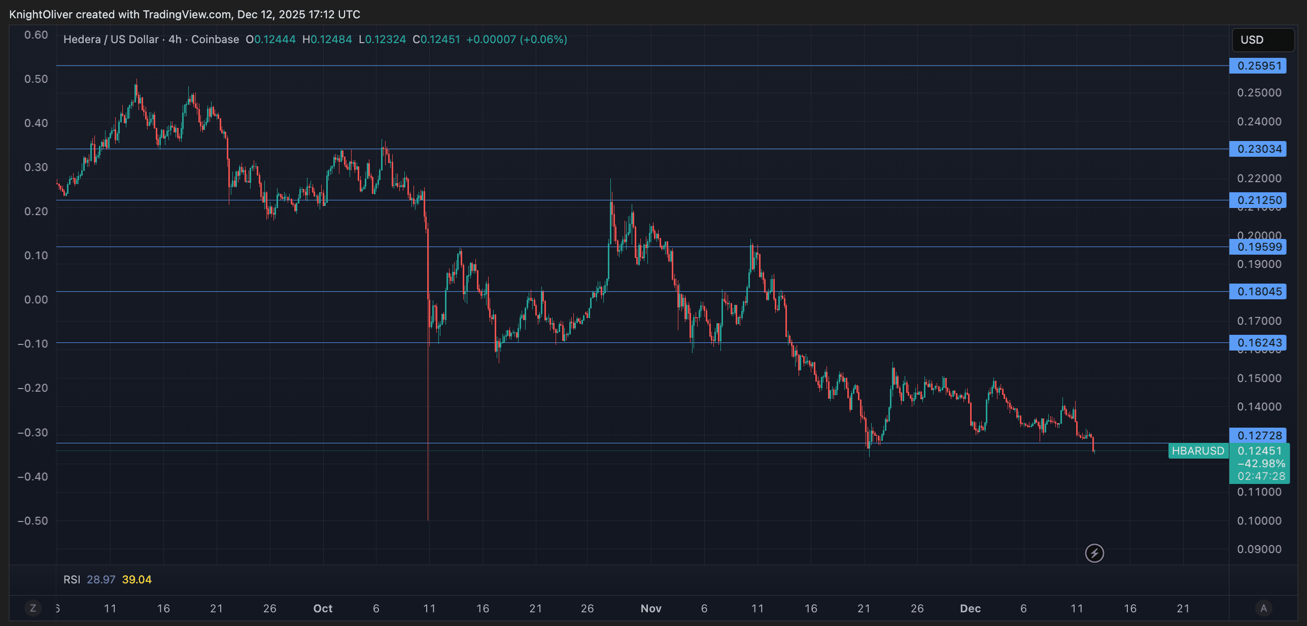HBAR witnessed a clear decline on Thursday after breaking several technical levels during a strong sell-off in the afternoon, causing the price to drop by 4% to $0.1247.
