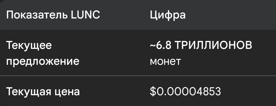 Dream math: For LUNC to be worth $1.00, with the current supply, its market capitalization would need to be $6.8 TRILLION. This is several times more than the total market capitalization of the ENTIRE current crypto market! This is economically impossible.