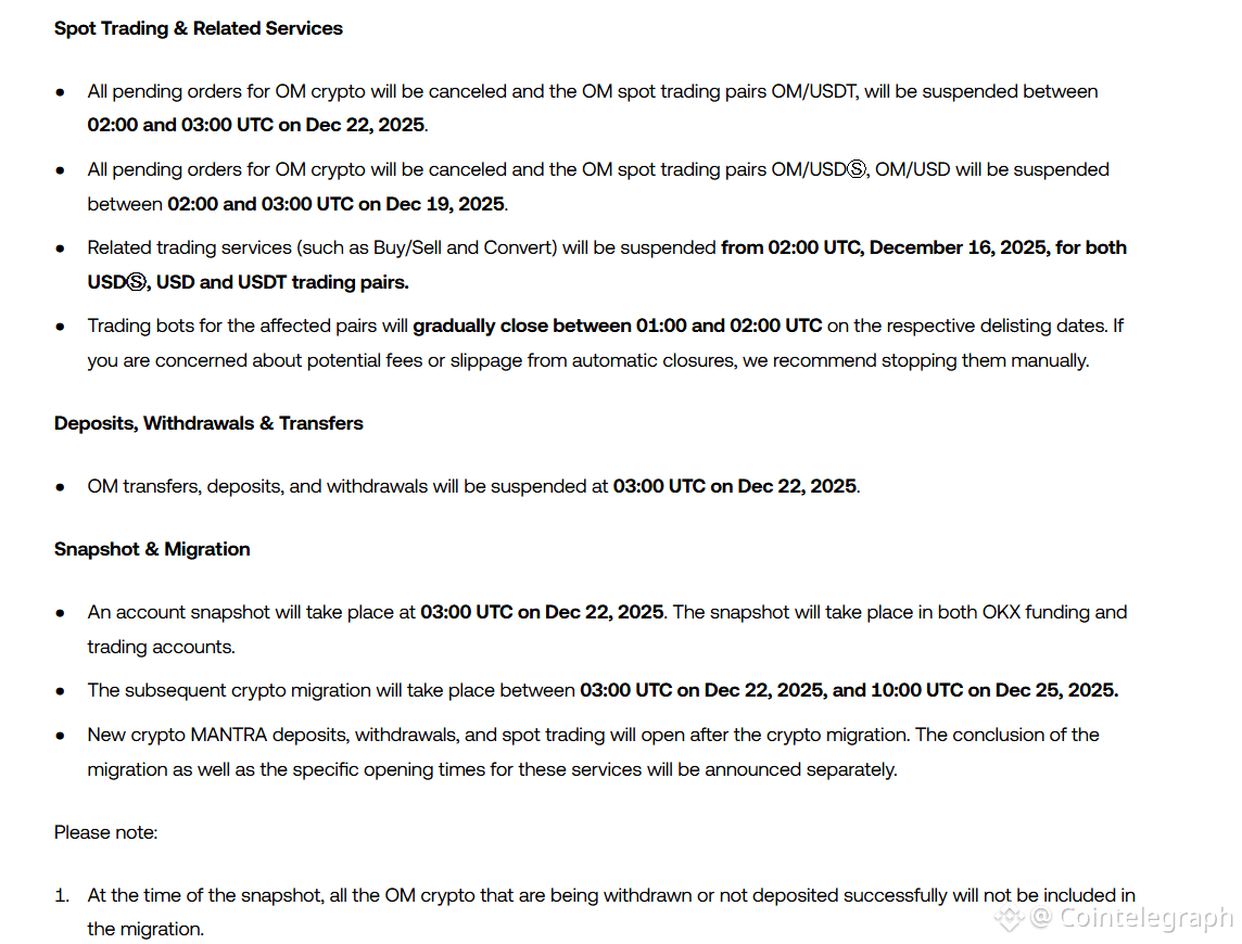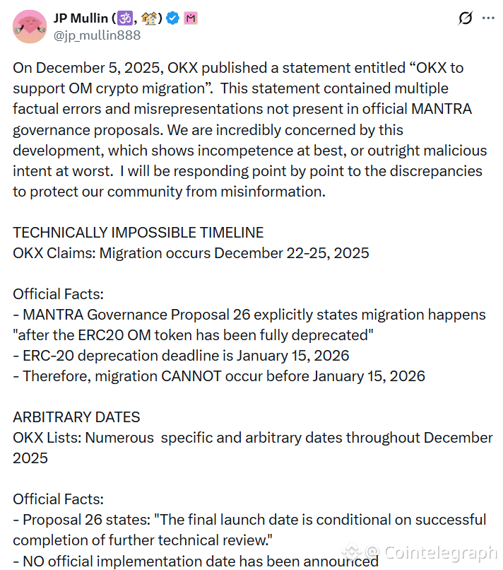 Mullin also said OKX’s post referenced “arbitrary dates throughout December 2025,” while Mantra has not yet announced an official implementation date.