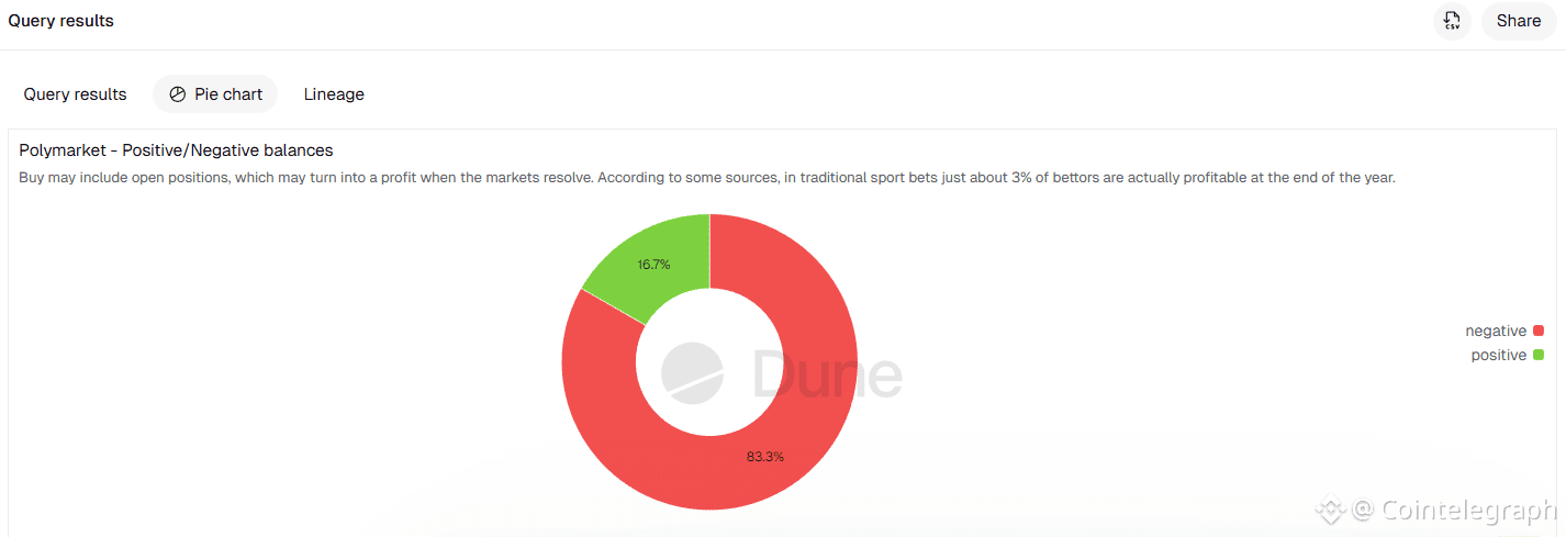 Only about 16.7% of wallets on Polymarket are in profit, while the remaining 83% have incurred losses, according to blockchain data from Dune.