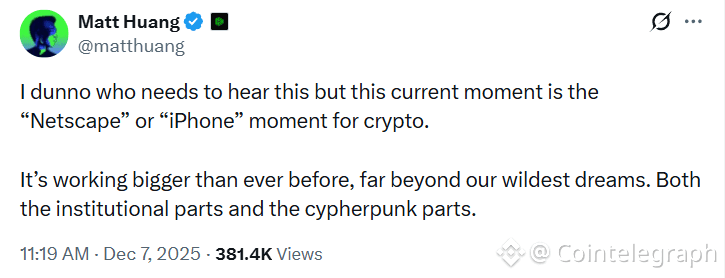 The crypto sector is “facing its ‘Netscape’ or ‘iPhone’ moment,” Huang wrote Sunday in a post on X. “It’s working bigger than ever before, far beyond our wildest dreams. Both the institutional parts and the cypherpunk parts.”