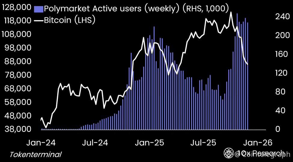 Polymarket active users, weekly, Bitcoin left-hand-side price, year-to-date chart. Source: 10x Research