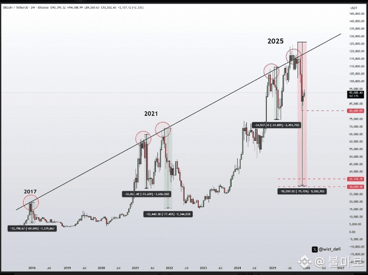 Fíjate en el punto de 2025 (la última caída en rojo). La vela roja actual no solo cayó fuerte (se habla de un bajón de casi $100,000 a $35,000 en el peor escenario dibujado, aunque la noticia nos dice que estamos en $85,000), sino que la mecha ya está tocando esa línea de tendencia maestra.
