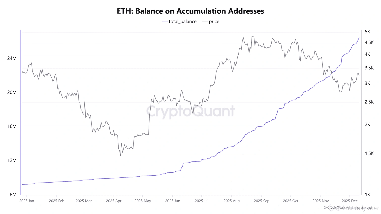 One of the most robust accumulation patterns in Ethereum is happening right now. The greatest monthly inflow for accumulation addresses in 2025 occurred in November, when 3.24 million ETH was collected, according to statistics from CryptoQuant.