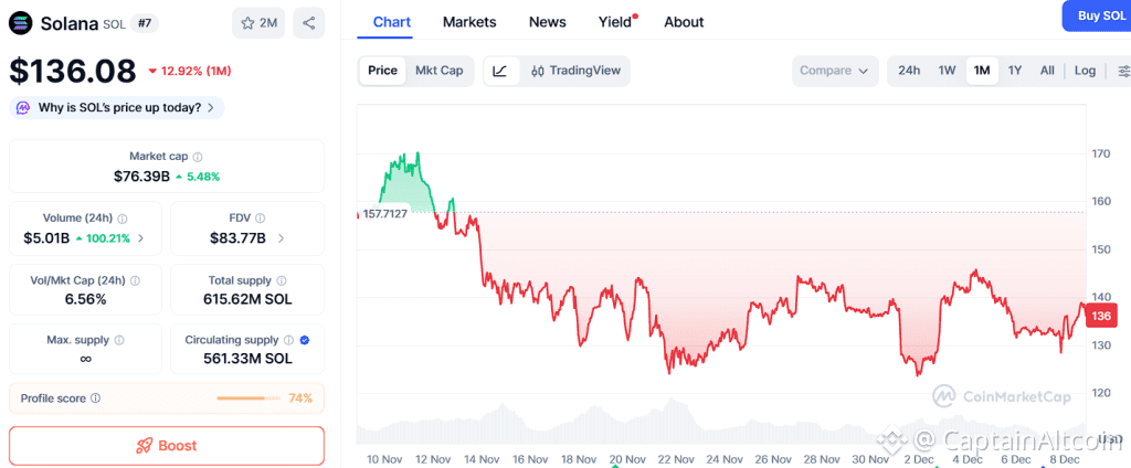 Solana trades around $136 and continues forming one of the most robust structures heading into the next cycle. Support at $133 holds the short-term trend, while deeper accumulation zones at $128 and $123 reinforce long-term strength. Solana begins building upward continuation as it approaches resistance at $141, with higher breakout regions at $146 and $152 — ranges that have historically triggered strong expansion phases.