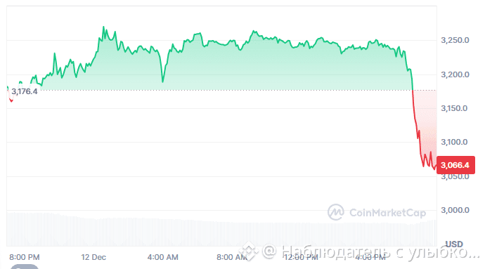24-часовой график показывает поздний сессионный рост, которому предшествовало недавнее снижение процентных ставок Федеральной резервной системы и жесткая позиция. В течение дня Ethereum торговался в диапазоне от 3175 до 3240 долларов, после чего быстро упал до 3053 долларов. Изменение отражает реакцию рынка на политические указания, а не внутреннюю слабость.