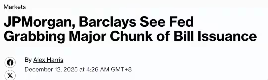 JPMorgan also raised expectations, predicting that the Federal Reserve will maintain a monthly purchase size of $40 billion until mid-April, and then reduce it to $20 billion per month. Combined with approximately $15 billion in MBS reinvestment each month, the total purchase amount by the Federal Reserve in the secondary market will reach $490 billion by 2026, resulting in a net issuance of only $274 billion in short-term Treasury bonds next year.
