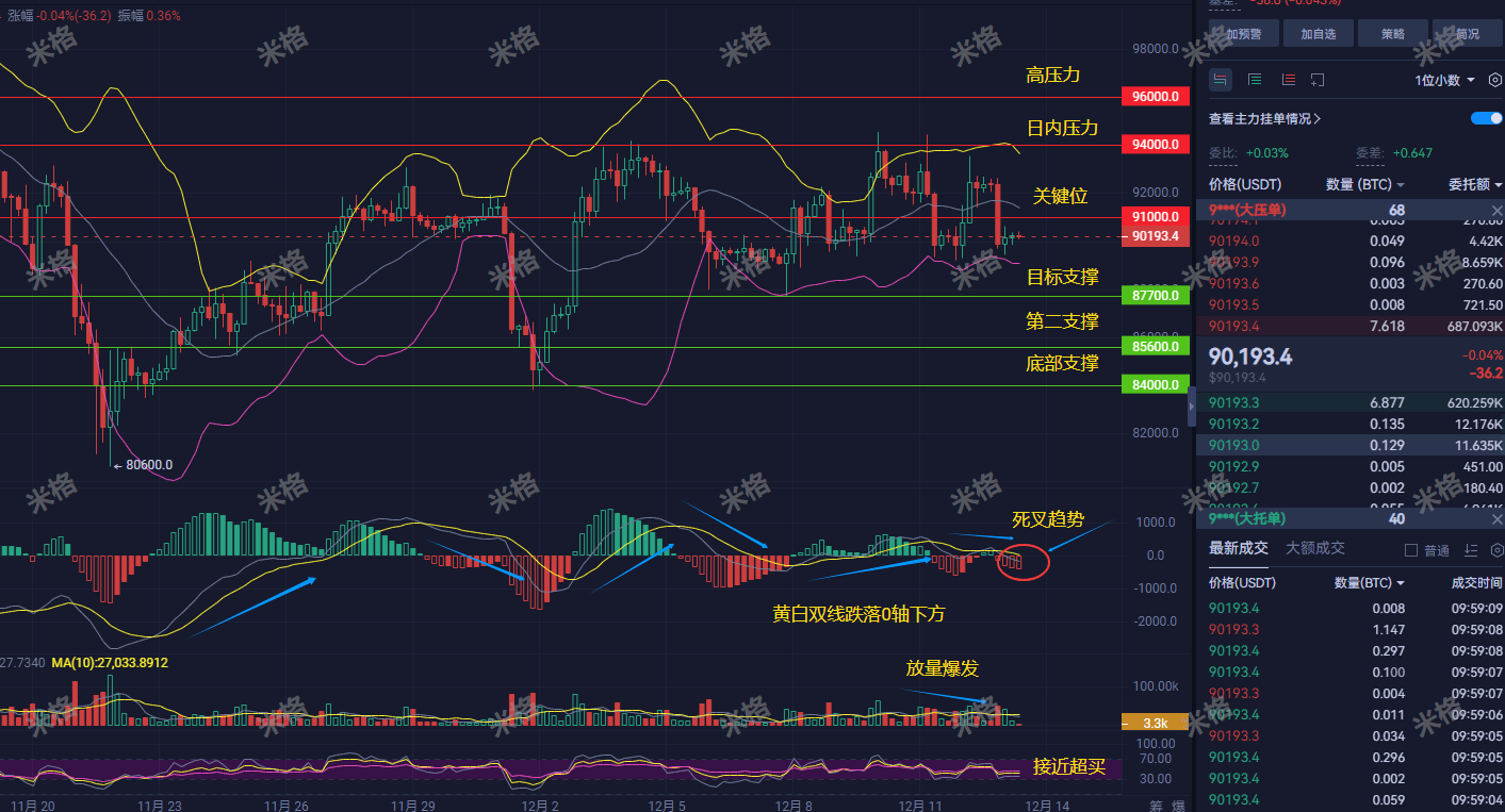 The MACD white and yellow lines have long since crossed below the 0 axis, which is a clear signal of medium-term weakness. The key resistance level is 91000; the current price cannot even stabilize here, how can we talk about reaching 94000? Support below at 87700, 85600, 84000, each layer lower than the last.