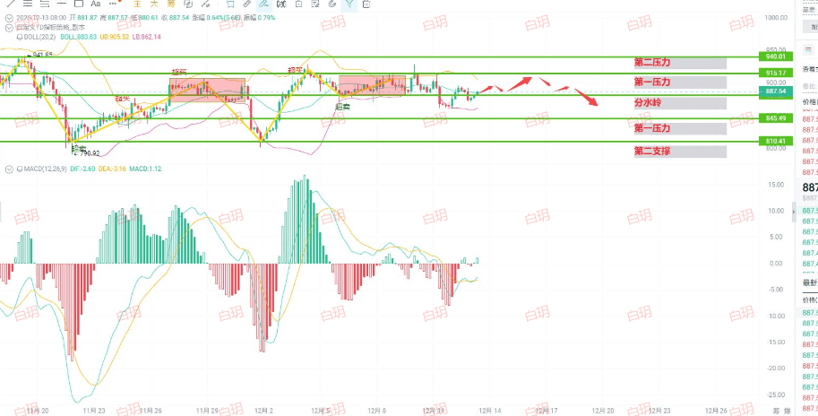 Lower support: $845.49 (first support), $810.41. From the trend, the market has gone through a 'rise followed by a fall', and it is currently competing near the watershed. The MACD indicator shows that although the DIF and DEA are still below the zero axis, green bars have appeared, indicating that the downward momentum has weakened and bulls are slowly building strength.