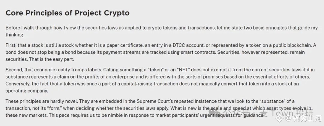 「无论股票是以纸质凭证、存托信托及结算公司(DTCC)账户记录,还是通过公共区块链上的代币形式呈现,它本质上仍然是股票;债券不会因为其支付流通过智能合约追踪,就不再是债券。无论以何种形式呈现,证券始终是证券,这一点很容易理解。」