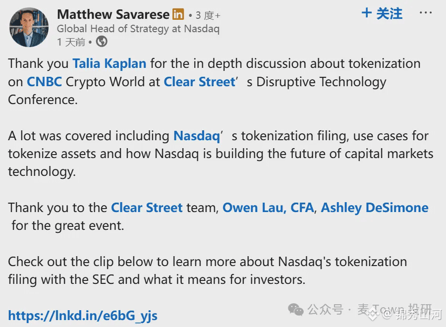 11 月 25 日,纳斯达克数字资产战略负责人 Matt Savarese 在接受 CNBC 采访时明确表示,已将代币化股票方案的 SEC 审批视为首要任务,将「以最快速度推进」,同时他也谨慎地强调,纳斯达克并非试图颠覆体系,而是要在监管框架下以「负责任」的方式推动资产上链。