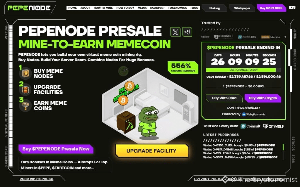 Pepenode is a unique meme coin project that allows users to virtually mine meme coins through a distinctive node system. By purchasing Pepenode tokens, investors can build their own virtual mining rigs, upgrade facilities, and combine nodes to increase mining power.