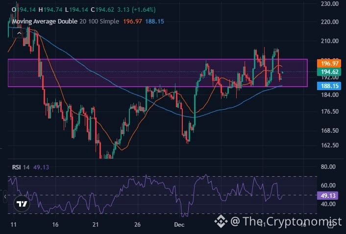 The ecosystem has paid over a billion dollars in interest and processed trillions in cumulative deposits, highlighting its scale and relevance in the broader blockchain space. $AAVE’s price is back in focus as the token hovers around $195 following a modest dip in the latest session.