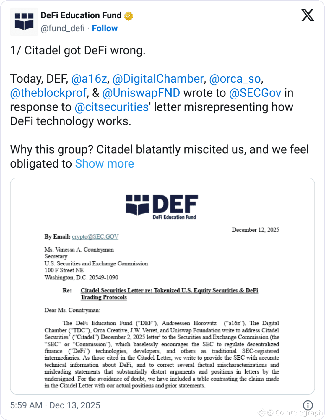 The group added they shared Citadel’s aims of investor protection and market integrity, but disagreed “that achieving these goals always necessitates registration as traditional SEC intermediaries and cannot, in certain circumstances, be met through thoughtfully designed onchain markets.”