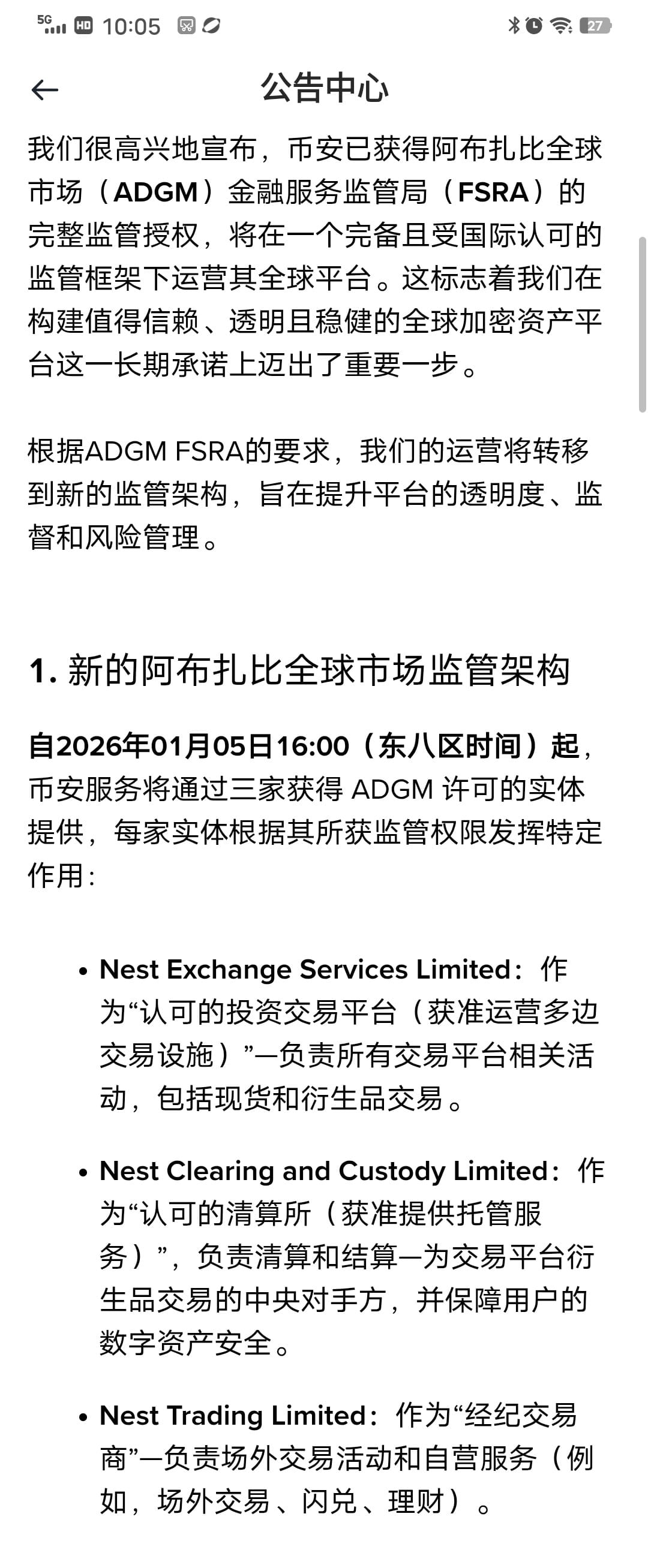 With the announcement on December 8, 2025, starting from 16:00 (Beijing time) on January 5, 2026, Binance's operations will shift to a new regulatory framework - Abu Dhabi Global Market (ADGM) Financial Services Regulatory Authority (FSRA):