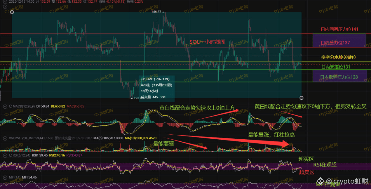 从1小时图看,SOL现在在132-133附近震荡。上面压力很明显:137是日内强压,再往上就是141。下面支撑看131,跌破的话可能去128附近找支撑。