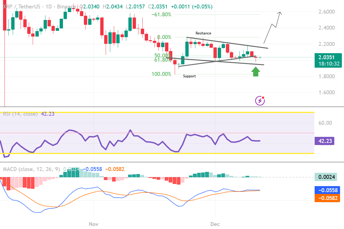 As of now, XRP is still oscillating around the 50% Fibonacci retracement level near $2.02, with overall volatility decreasing, and structurally it is gradually forming an ascending triangle.