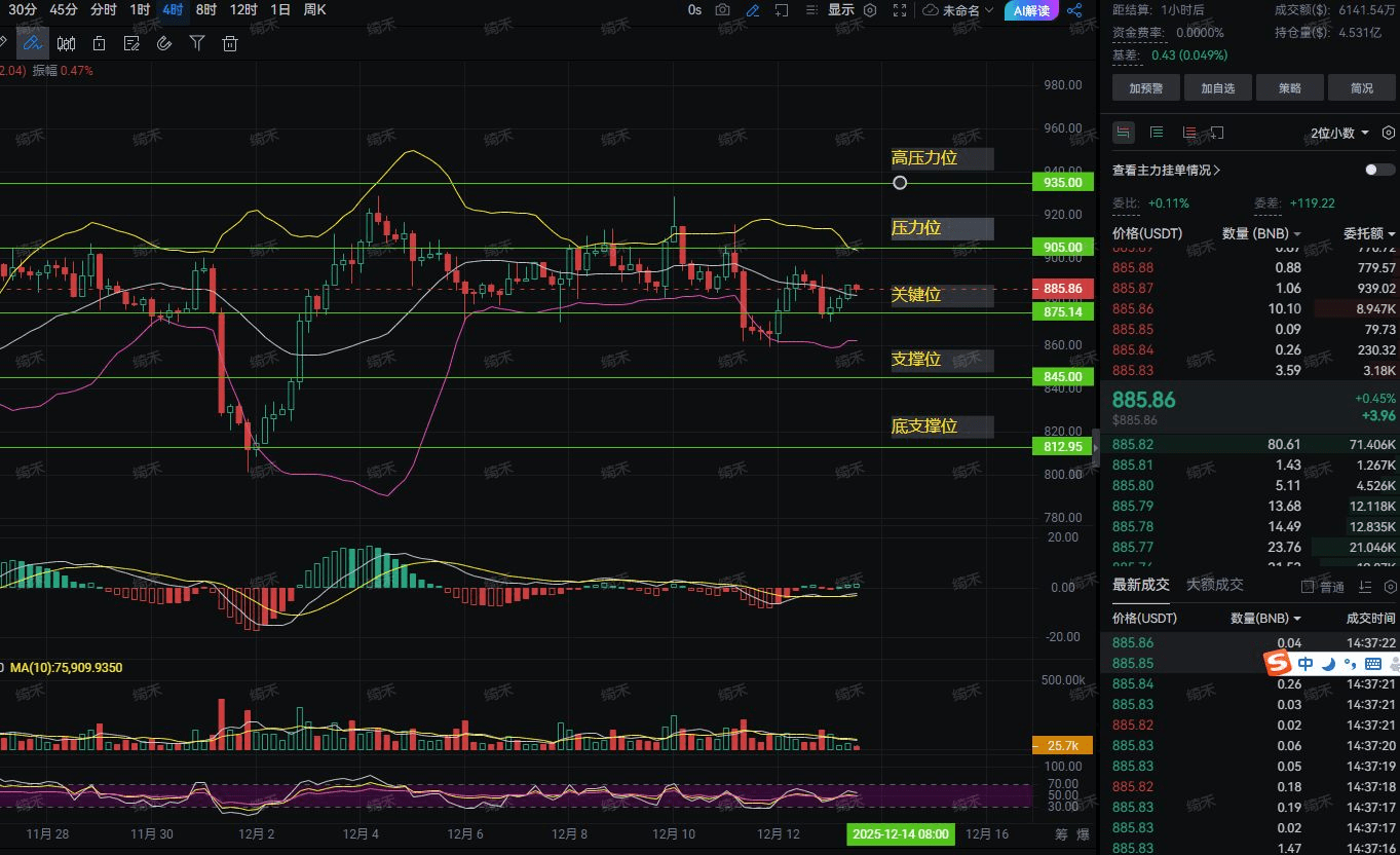 Good evening, I am Qi He. Just now, while reviewing, I suddenly received an urgent call from a friend: 'Qi He, this wave of BNB's rise is making me anxious; I don’t dare to chase, and I don’t dare to short. What should I do tonight?' I looked at the chart, and coincidentally, the 4-hour chart is stuck at a 'critical point'! If you're also struggling with whether to rush to 905 or wait at 845, this article is written for you. Follow Qi He, and every day I will help you dig for gold from the candlesticks!