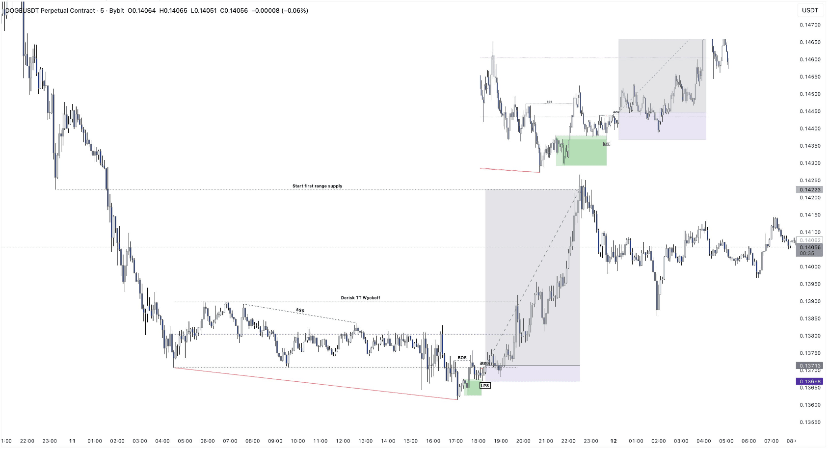 Looking at smaller time frames, Dogecoin has also exhibited the range oscillation structure of Wyckoff Model 1. When the third candlestick opens and the price moves downward, it’s crucial to focus on signals like LPS, BOS, and internal BOS.